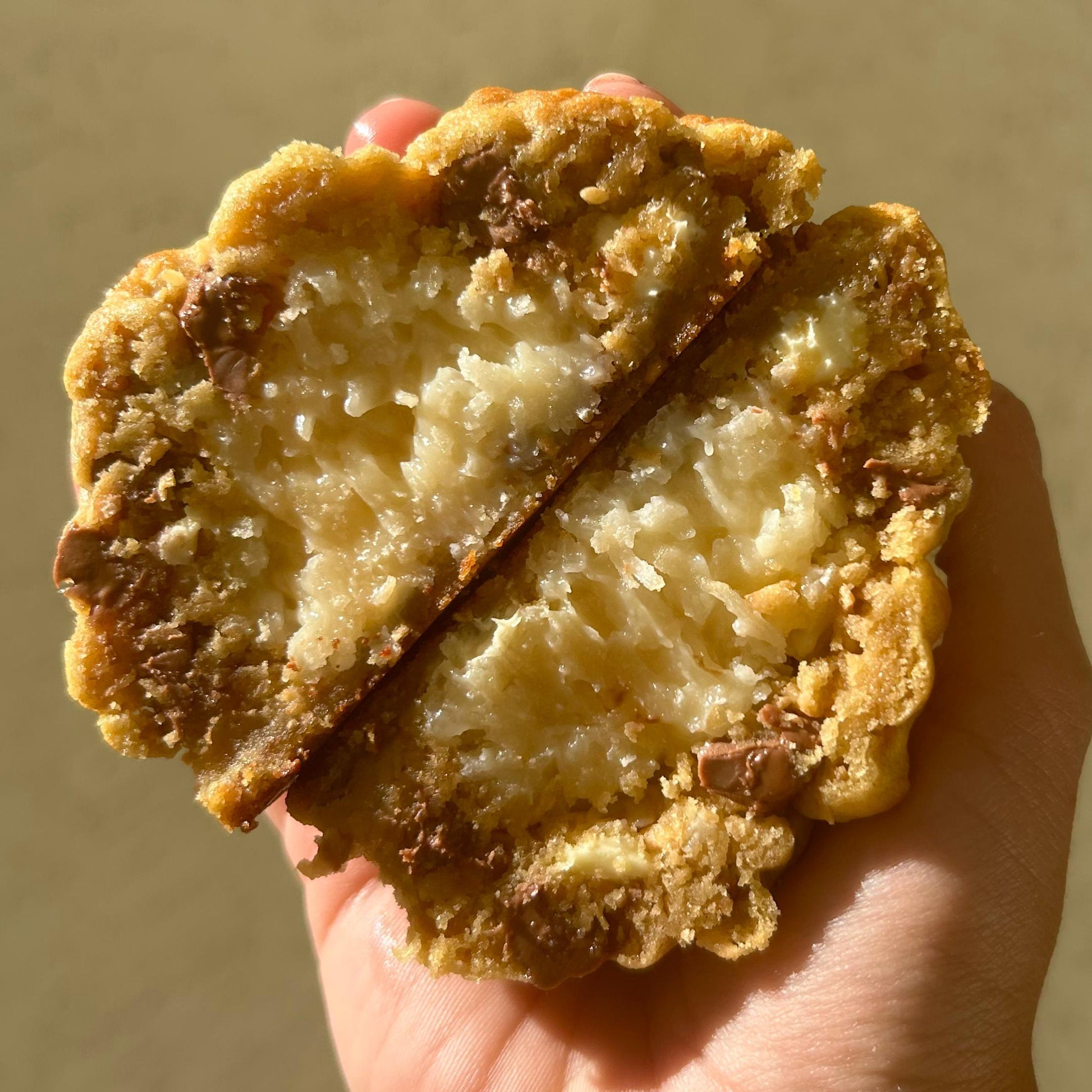 Vanilla cookie with a delicious mix of white and dark chocolate chips, filled with a creamy and sweet homemade coconut flavor. Each bite combines the best of coconut with the classic taste of vanilla, creating a soft, crunchy, and totally irresistible experience.